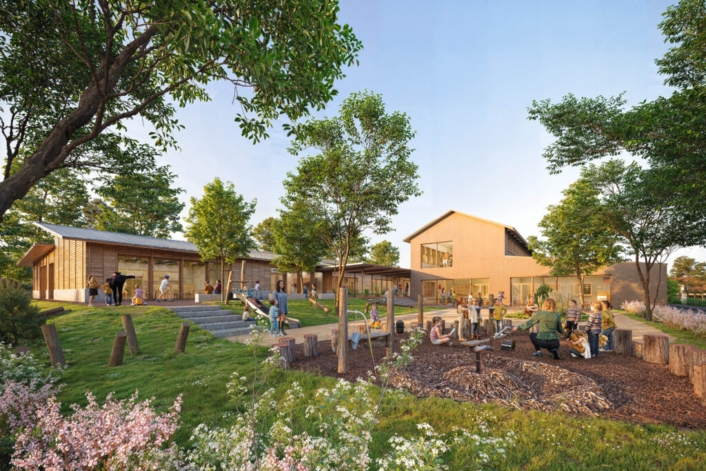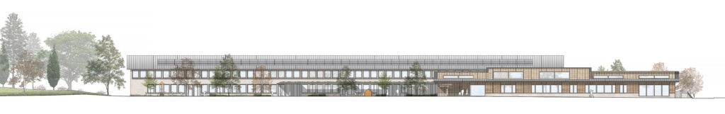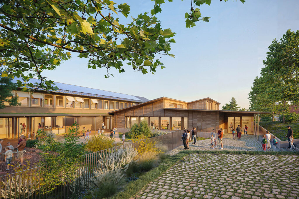 Réhabilitation et extension d’un groupe scolaire élémentaire et maternelle et d’un périscolaire. Le projet s’organise en lanières : l’élémentaire réhabilitée, un auvent entre les différentes entités, puis l’école maternelle, en proue, venant redessiner les espaces publics. L’extension, en structure à ossature et vêture bois vient dialoguer avec le bâtiment existant, traité en enduit texturé et animé par des stores à projection.